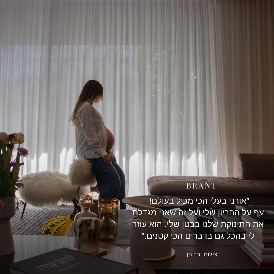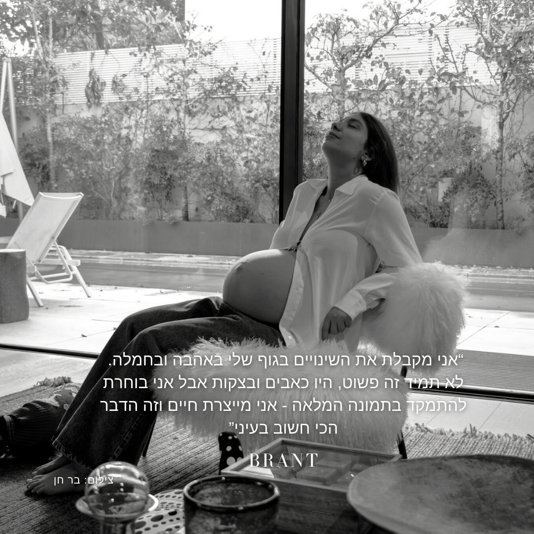 ישבנו לשיחה פתוחה עם מאי חקק הרשקוביץ שהיום היא בשבוע 35 ורגע לפני לידה. היא בת 29, מנהלת השיווק של שני מותגים בינלאומיים Parfois ו-Furla. היא נשואה לאורני כבר שנתיים, אבל הסיפור שלהם ארוך יותר: תשע שנים יחד. עד לא מזמן הם גרו בתל אביב, ובתקופה האחרונה, רגע לפני הלידה, עברו לרעננה. מעבר שנסגר בשקט, בלי הצהרות גדולות, אבל עם תחושה ברורה של פרק חדש.